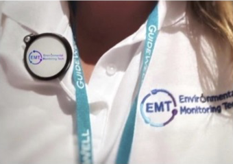 The badge should be placed on the collar/lapel at breathing zone level. Breathing zone is 10 inches radius of a worker’s nose and mouth.